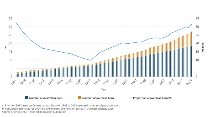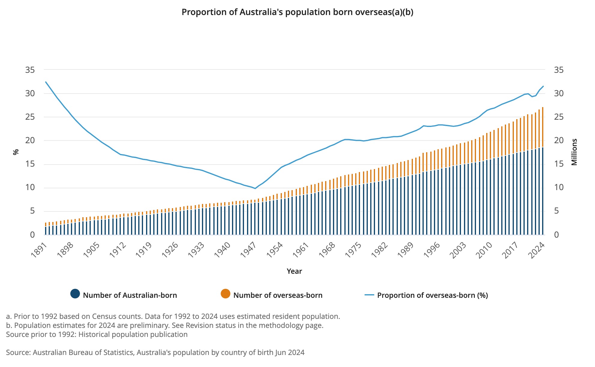 Australia’s foreign born population grew to more than 30 per cent in 2024. It’s the highest percentage of foreign born in the country since the late 19th century.