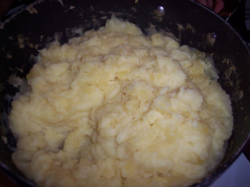 - Mash the potatoes, then add butter and cream. Sir thoroughly until you have a smooth paste.